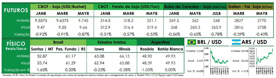 O movimento de baixa se intensifica na CBOT hoje, que ain- da observa um baixo interesse especulativo e operações em ritmo lento. Os mapas climáticos para os próximos 5 dias agora já cobrem quase toda a primeira rodada de chuvas que vem sendo oferecida para a Argentina e o Extremo Sul do Brasil. A ARC lembra que os atuais níveis de umidade do solo argentino são muito inferiores ao ano passado. A estiagem no país que já se estabelece por quase 11 dias, perdura até a tarde do dia 14, quando precipitações de 10-20mm deverão cair sobre o Centro e Leste da Argentina. O movimento de venda dos fundos de investimento já deve empilhar um total de 97-99 mil contratos líquidos vendidos na soja, até hoje. As expectativas baixistas dos relatórios do USDA e CONAB desta semana colocam a preocupação especulativa no pressionamento dos preços aqui em Chicago. A tendência de baixa deve continuar até a publicação dos novos números do USDA, na sexta-feira. As recuperações do Mercado serão limitadas até qualquer novidade climática ameaçadora.