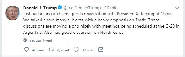 "Tive uma longa e muito boa conversa com o presidente da China, Xi Jinping. Conversamos sobre muitos assuntos, com forte ênfase no comércio. Essas discussões estão indo muito bem com as reuniões sendo agendadas no G-20 na Argentina. Também tivemos uma boa discussão sobre a Coreia do Norte!"