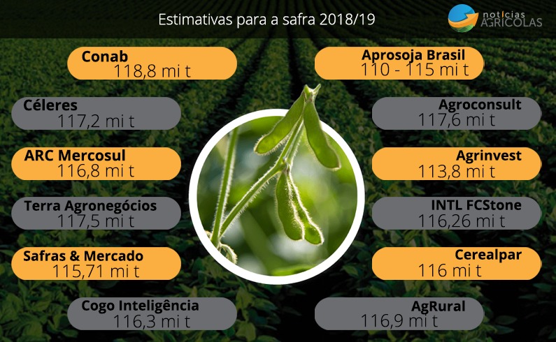 A Conab, em seu último boletim, trouxe seu número em 118,8 milhões de toneladas e a Aprosoja Brasil, em seu posicionamento mais recente falou entre 110 e 115 milhões de toneladas.