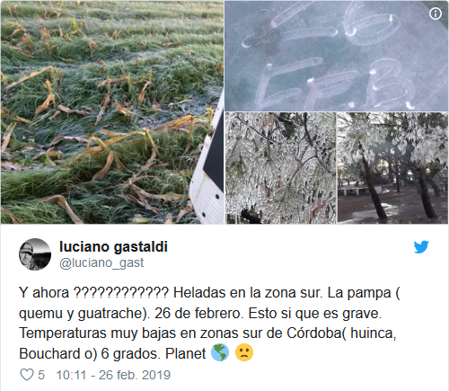 Em La Pampa, a situação foi ainda mais surpreendente, já que se observaram sintomas de geadas, como reportou Luciano Gastaldi, engenheiro agrônomo e especialista em proteção vegetal da Universidade Católica da Córdoba.