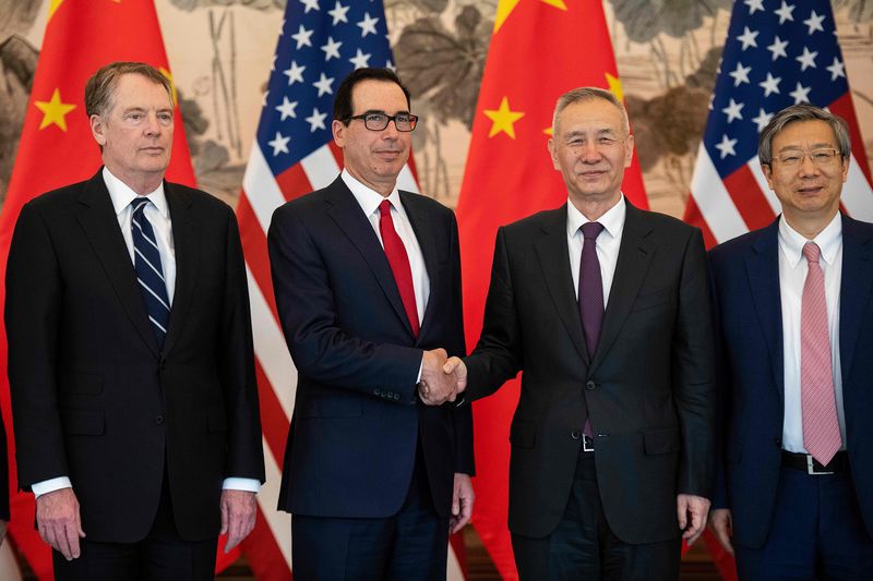 Ao centro, Steve Mnunchin e Liu He dão as mãos - Foto: Nicolas Asfouri/AFP via Getty Images