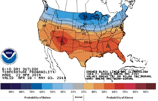 "O cenário climático para os Estados Unidos tem melhorado, conforme nos aproximamos do fim do mês de abril. Os mapas, que anteriormente traziam a permanên-cia de chuvas excessivas para os primeiros dias de maio, agora trazem