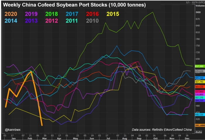 O gráfico abaixo também é do portal Cofeed, citado pela especialista internacional em commodities da Reuters, Karen Braun, sobre os estoques de soja nos portos da China. "São 3,92 milhões de toneladas, uma baixa recorde para o meio de março, superando a mínima de 3,95 milhões de abril de 2013", explica Karen. As comparações voltam até 2010.