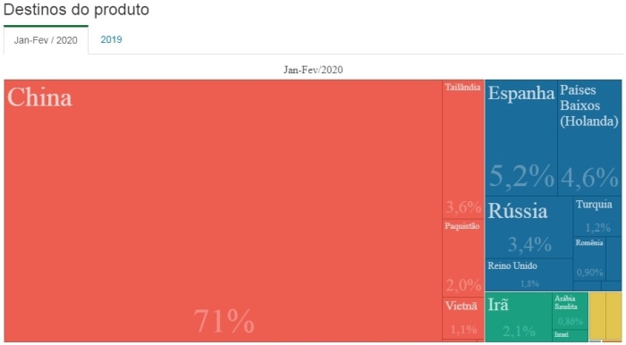 Gráfico mostra exportações de soja do Brasil no acumulado de janeiro a fevereiro detalhando seus principais destinos - Fonte: Secretaria de Comércio Exterior