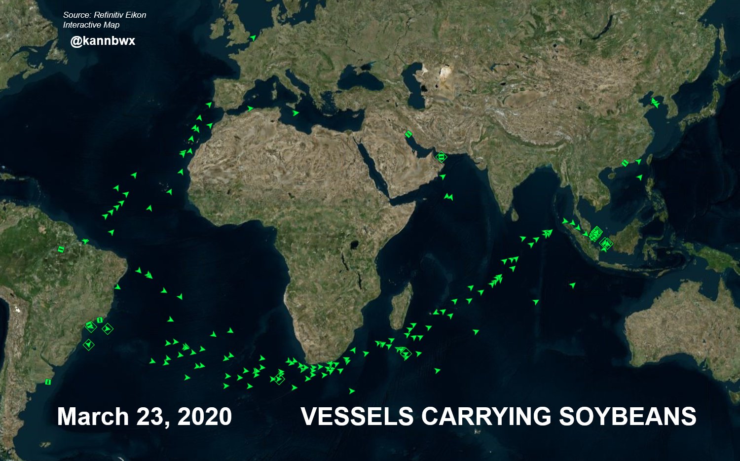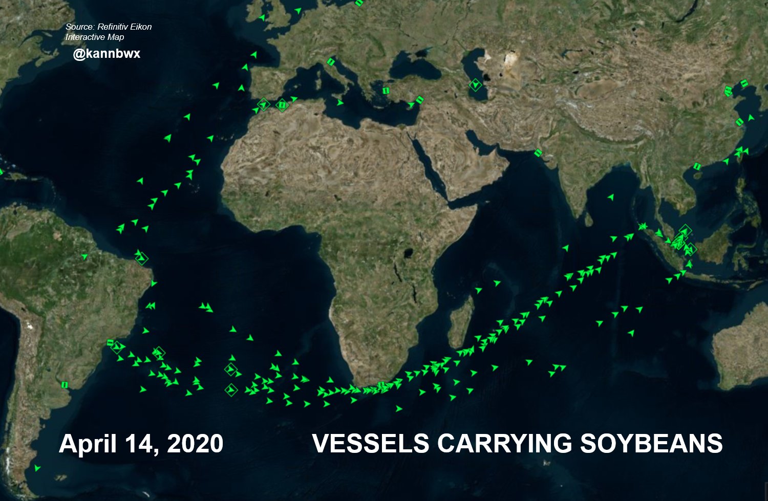 A imagem abaixo, do sistema Refinitiv Eikon e trazida pela analista da Reuters Internacional Karen Braun, mostra o fluxo de navios carregando soja da América do Sul para a China em 14 de abril deste ano. Na sequência, a imagem traz as condições em 23 de março de 2019.