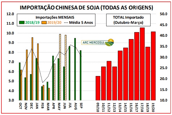 "A soja brasileira segue aquecida por exportação e desvalorização cambial. A China tem reconstruído seus estoques de reserva da oleaginosa, já visando o reaquecimento do consumo no pós-COVID19. Seguindo o fluxo semanal de desembarques em solo chinês, já pode ser projetado que em abril o país asiático importará algo perto de 7 milhões de soja e quase 10 milhões e maio", explicam os analistas da ARC Mercosul.