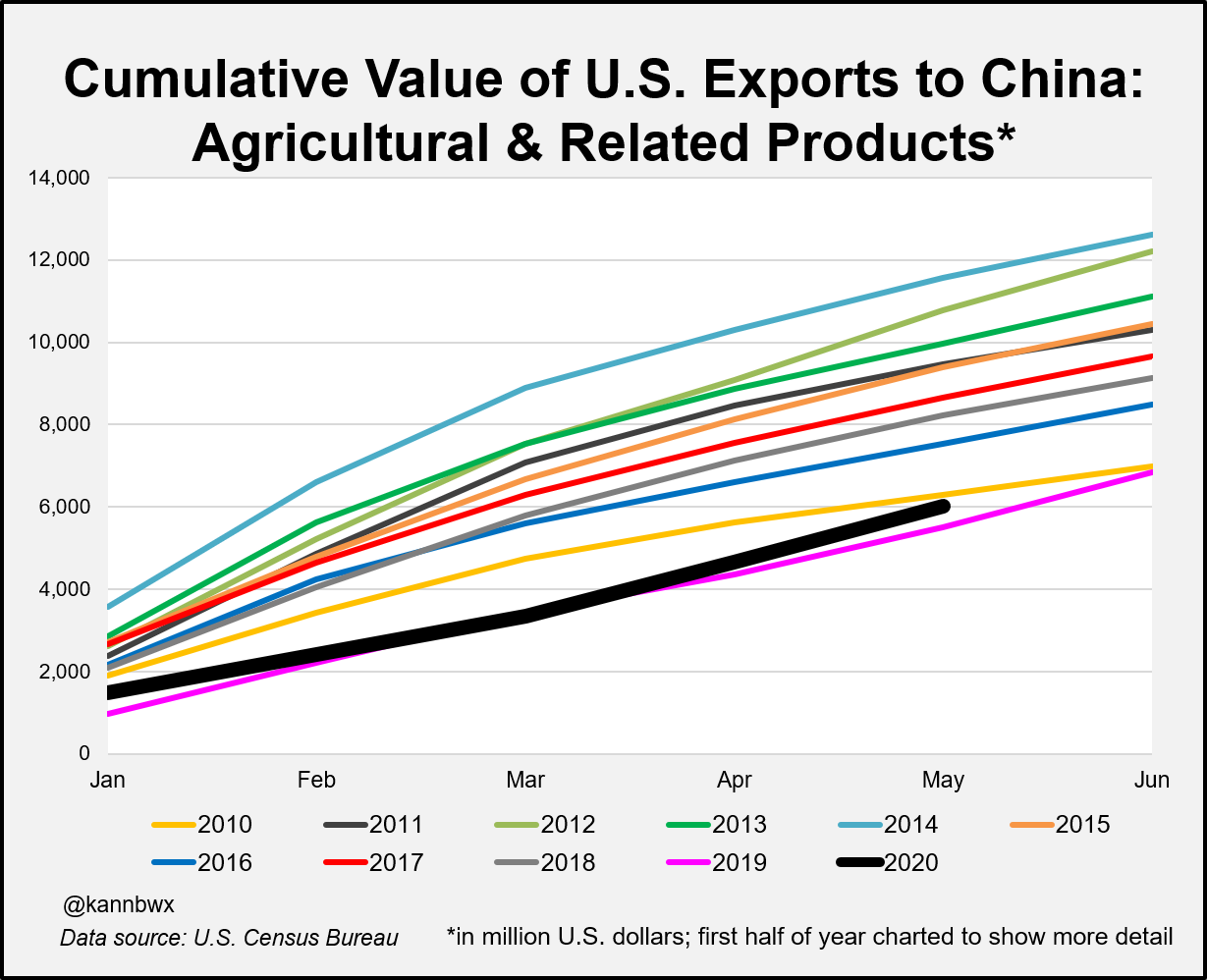 Ao contabilizar todas as vendas de produtos agrícolas dos EUA para a China, de janeiro a maio, a receita é de US$ 6,01 bilhões. Salvo 2019, este é o menor valor para o período desde o mesmo intervalo em 2009, segundo a especialistas em commodities agrícolas, Karen Braun.