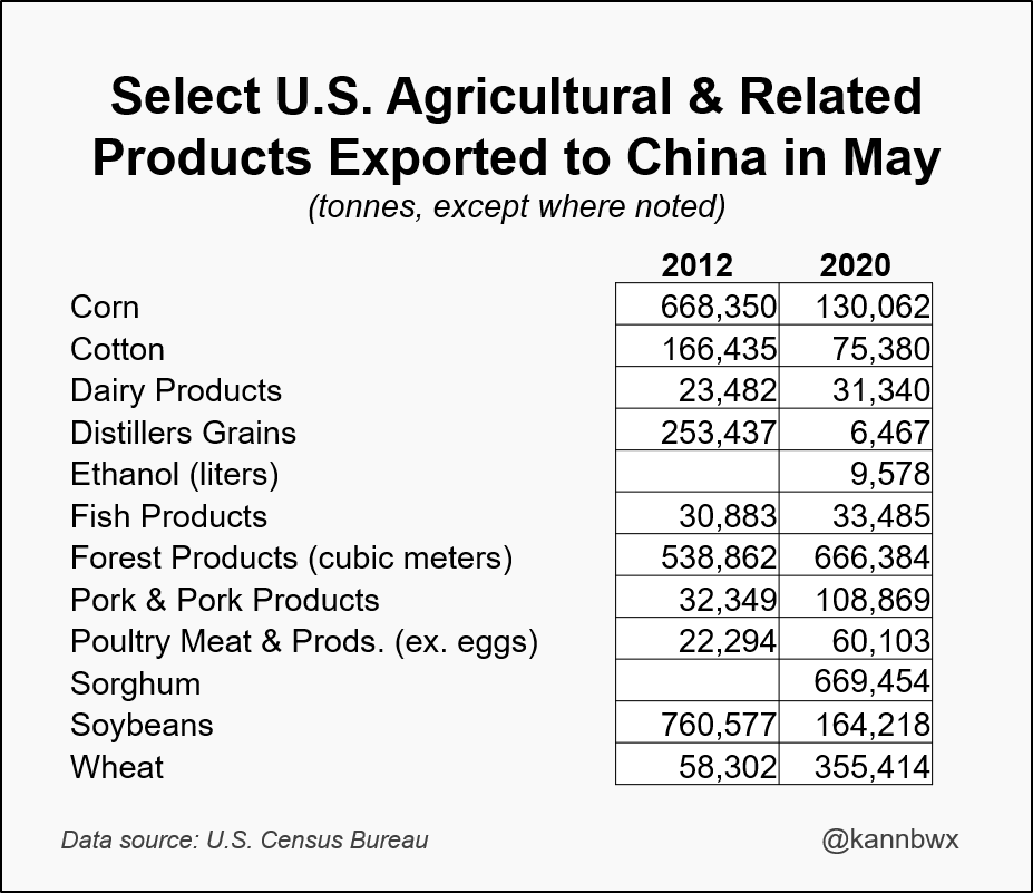 A tabela a seguir, com dados do U.S. Census Bureau, compilados por Karen Braun, compara os volumes de produtos agrícolas comprados pela China nos EUA em maio de 2012 e 2020: