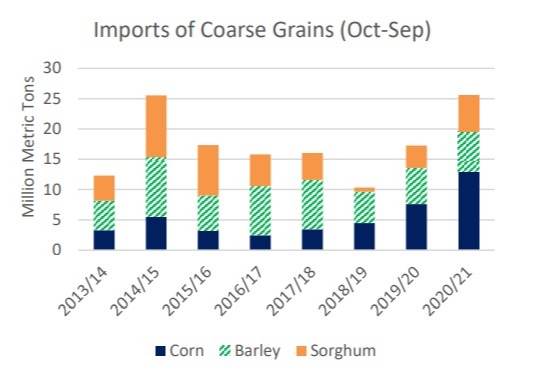 O USDA trouxe, também em seu reporte da última terça-feira (10), as importações totais de grãos da China deverão alcançar um nível recorde no presente ano comercial, alimentadas, principalmente, por uma maior demanda do setor de rações. O milho deverá liderar o aumento das compras, como mostra o gráfico a seguir: