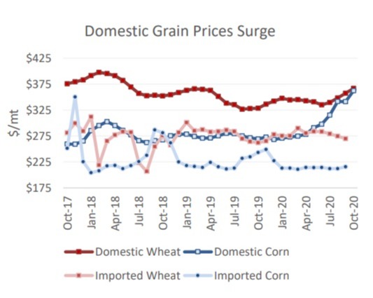 Gráfico mostra os preços do milho (em azul) e do trigo (em vermelho) na China - Fonte: USDA