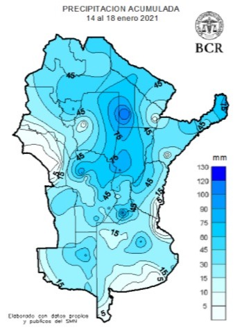 Chuvas acumuladas na Argentina entre 14 e 18 de janeiro 2021 - Fonte: Bolsa de Comércio de Rosário