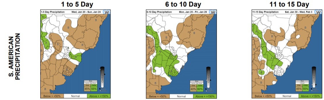 Os mapas trazidos pelo CWG para os próximos dias sinalizam ainda chuvas abaixo da média entre 20 e 24 de janeiro, mas acima nos dois períodos seguintes - de 25 a 29 e de 30 de janeiro a 3 de fevereiro.