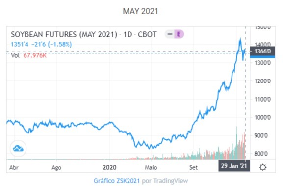 Comportamento do contrato maio/21 de soja na Bolsa de Chicago
