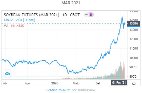 Comportamento do contrato março/21 de soja na Bolsa de Chicago