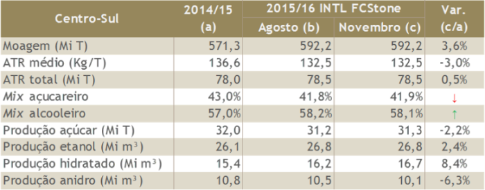 Em relação à produção de açúcar, a expectativa é que as usinas da região produzam 3,1 milhões de toneladas, queda de 13,6% em relação ao ciclo anterior. O mix produtivo foi mantido, com as usinas da região aumentando ligeiramente o foco no etanol em relação à última temporada, devido tanto ao aumento do preço do biocombustível como à redução na demanda interna por açúcar devido à recessão vivida pelo país.