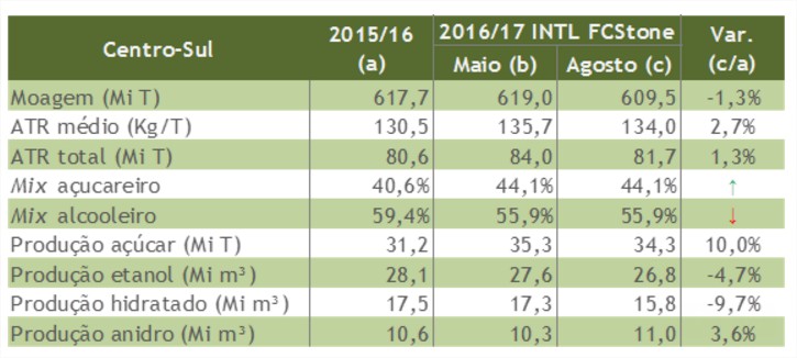 No que diz respeito ao mix produtivo, foi mantida a estimativa de participação de 44,1% do açúcar, 3,5 pontos percentuais acima de 2015/16. A produção de anidro foi aumentada para 11 bilhões de litros, 3,6% a mais do que o registrado na safra 2015/16 e mais próxima da máxima registrada em 2013/14, enquanto a produção projetada de hidratado foi reduzida para 15,8 bilhões de litros, 9,7% abaixo da safra passada.