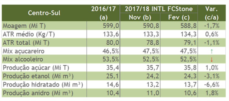 Os efeitos da idade avançada dos canaviais do Centro-Sul brasileiro devem acarretar em perdas sobre a produtividade agrícola do ciclo 2017/18. Analisando a disponibilidade de cana considerando esses efeitos, somados à irregularidade na ocorrência de chuvas durante a entressafra, a INTL FCStone reduziu sua estimativa de moagem no ciclo 2017/18 para 588,8 milhões de toneladas de cana-de-açúcar.