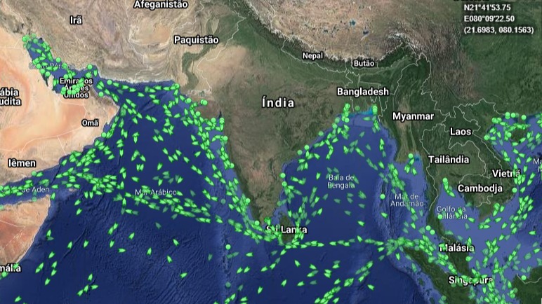 Fluxo de navios de carga nos arredores da Índia - Imagem: MarineTraffic