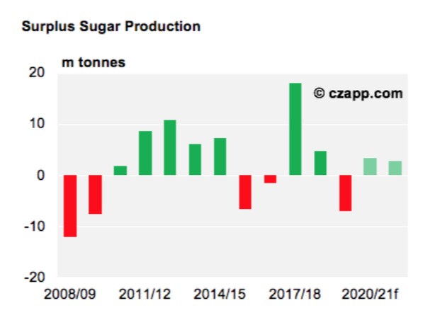 Excedente global de açúcar em 2008/09, 2011/12, 2014/15, 2017/18 e 2020/21 - Fonte: Czarnikow