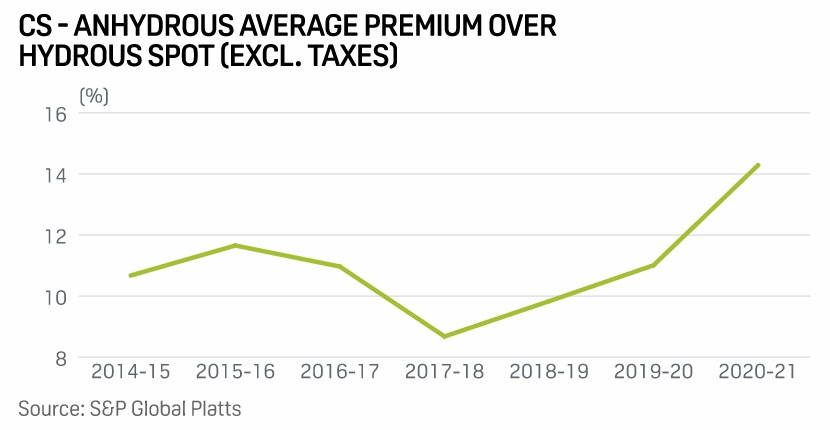 Centro-Sul - Prêmio médio do anidro sobre o spot hidratado (excluindo taxas) - S&P Global Platts
