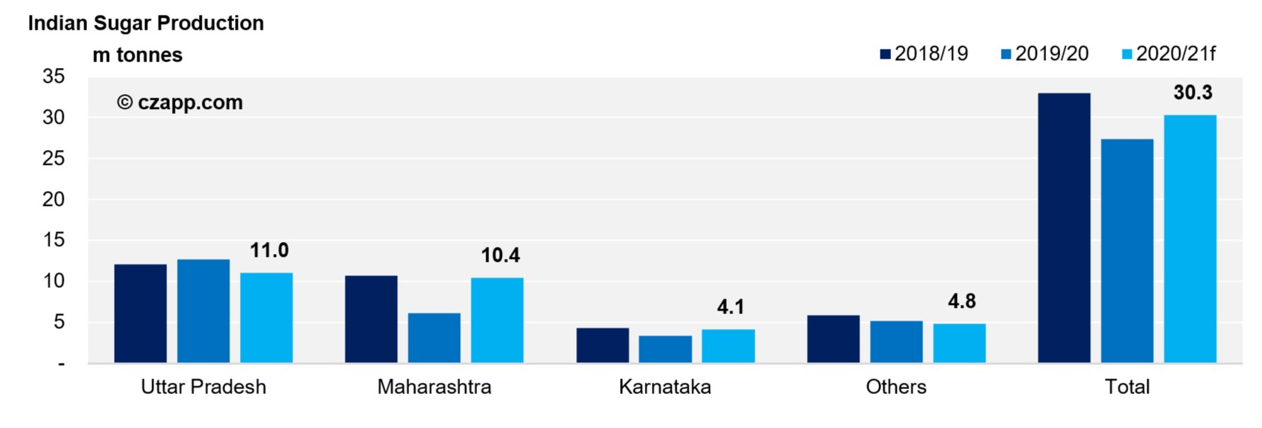 Produção de açúcar na Índia nas últimas duas safras e estimativa para 2020/21 - Fonte: Czarnikow