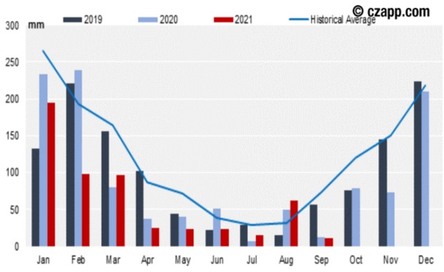 O ano de 2021, até o mês de maio, registrava no Centro-Sul do Brasil volume de chuva 44% abaixo da média histórica, segundo a trading inglesa Czarnikow, com eminentes impactos para a safra de cana-de-açúcar. Para o mês de junho, a situação não deve ser diferente, com estimativa de que as precipitações fiquem 41% abaixo da média.