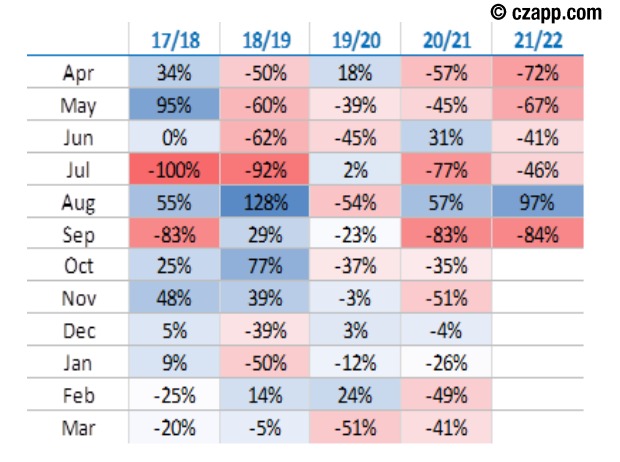 Os níveis mensais de chuva no Centro-Sul do Brasil estão abaixo da média desde setembro do ano passado, segundo aponta a apuração da Czarnikow. Nos primeiros meses da safra 2021/22 (abril-março), esse cenário seguiu, com -72% em abril, -67% em maio e projeção de -41% em junho. Apenas em agosto é que há a previsão de que as chuvas fiquem dentro da média histórica.