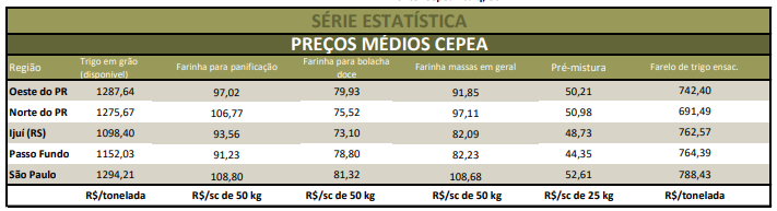 Em maio, as cotações das farinhas destinadas à panificação, bolacha salgada, pré-mistura, massas em geral, bolacha doce, massas frescas e integral subiram 6,46%, 4,93%, 4,86%, 4,60%, 4,51%, 3,91% e 2,94%, respectivamente. Para os farelos, houve valorização de 9,93% para o a granel e de 5,64% para o ensacado.