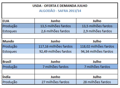 A produção mundial de algodão foi estimada em 118,02 milhões de fardos, número maior do que o reportado em junho, de 117,16 milhões de fardos. Por outro lado, os números referentes à produção norte-americana foram mantidos em 13,5 milhões de fardos. Já os estoques dos EUA foram projetados em 2,9 milhões de fardos contra 2,6 milhões de fardos estimados no relatório anterior.