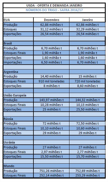 Nesta quinta-feira (12), o USDA (Departamento de Agricultura dos Estados Unidos) divulgou seu novo boletim de oferta e demanda para o trigo na temporada 2016/17. Para a safra global, o órgão aumentou sua projeção de 751,26 milhões de toneladas para 752,69 milhões de toneladas. Os estoques finais mundiais também foram revistos para cima e passaram de 252,14 milhões para 253,29 milhões de toneladas.