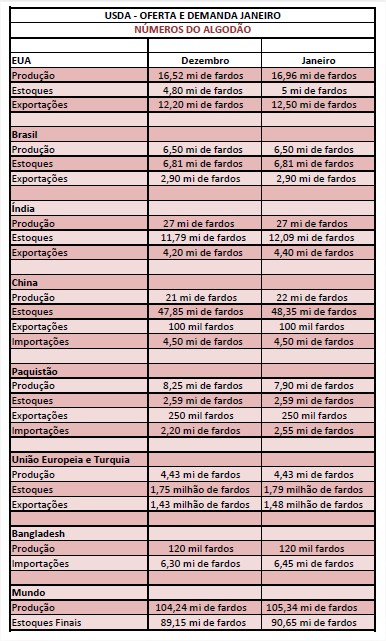 Para o Paquistão, o USDA revisou para baixo a perspectiva para a produção estimada em 7,90 milhões de fardos. Em dezembro, o número era de 8,25 milhões de fardos. As importações subiram de 2,20 milhões para 2,55 milhões de fardos. As exportações permaneceram em 250 mil fardos e os estoques finais em 2,59 milhões de fardos.