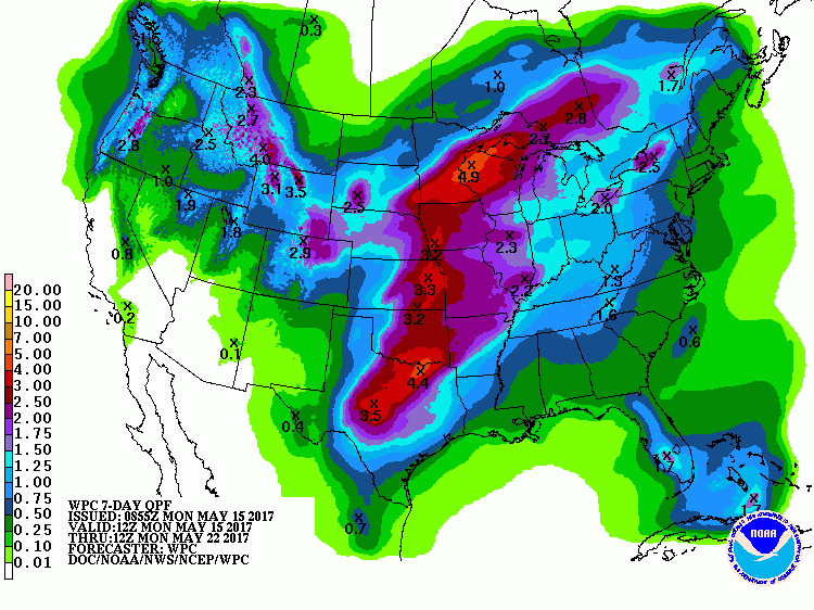 Para os próximos dias, são esperadas mais chuvas no Meio-Oeste americano, porém, acontecendo de forma mais localizada. Ainda assim, os volumes deverão ser elevados nos acumulados dos próximos 5 e 7 dias, como ilustram os mapas atualizados do NOAA, a agência oficial de clima do governo norte-americano.