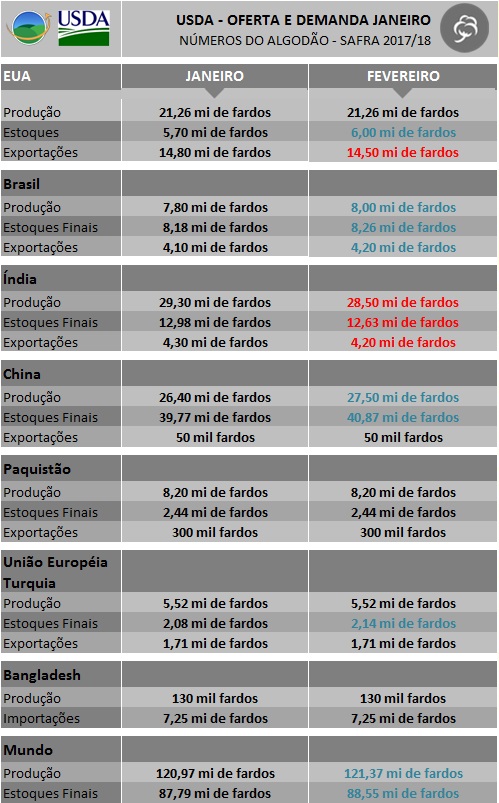 Em janeiro, o número ficou em 120,97 milhões de fardos. Já os estoques finais globais subiram de 87,79 milhões para 88,55 milhões de fardos neste ciclo.