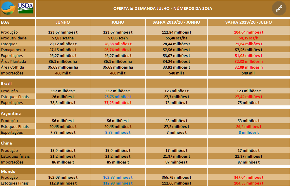 A produção global de soja 2018/19 foi corrigida para cima e estimada em 362,87 milhões de toneladas, conra 362,08 milhões de junho. Os estoques finais subiram para 112,98 milhões.