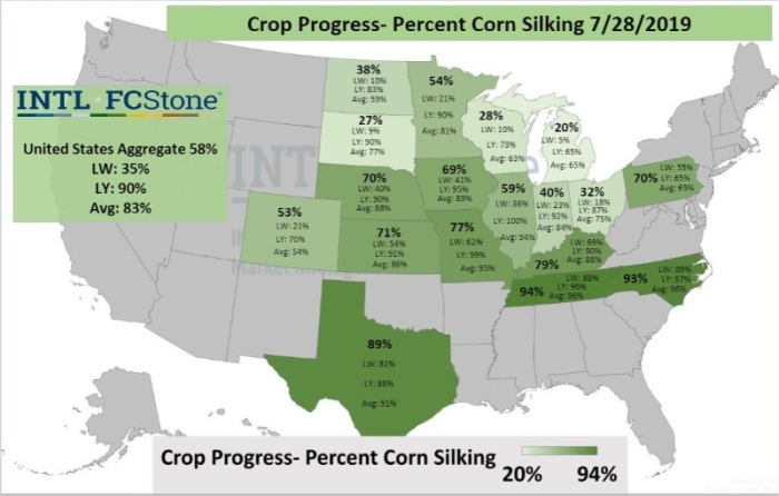 Sobre o embonecamento do milho, o mapa também da INTL FCStone mostra que o maior atraso está em Michigan, onde apenas 20% das lavouras já alcançaram este estágio, contra 65% do mesmo período do ano passado. Em Ohio, o desenvolvimento também está atrasado e chega a apenas 32% dos campos, enquanto eram 87% há um ano.
