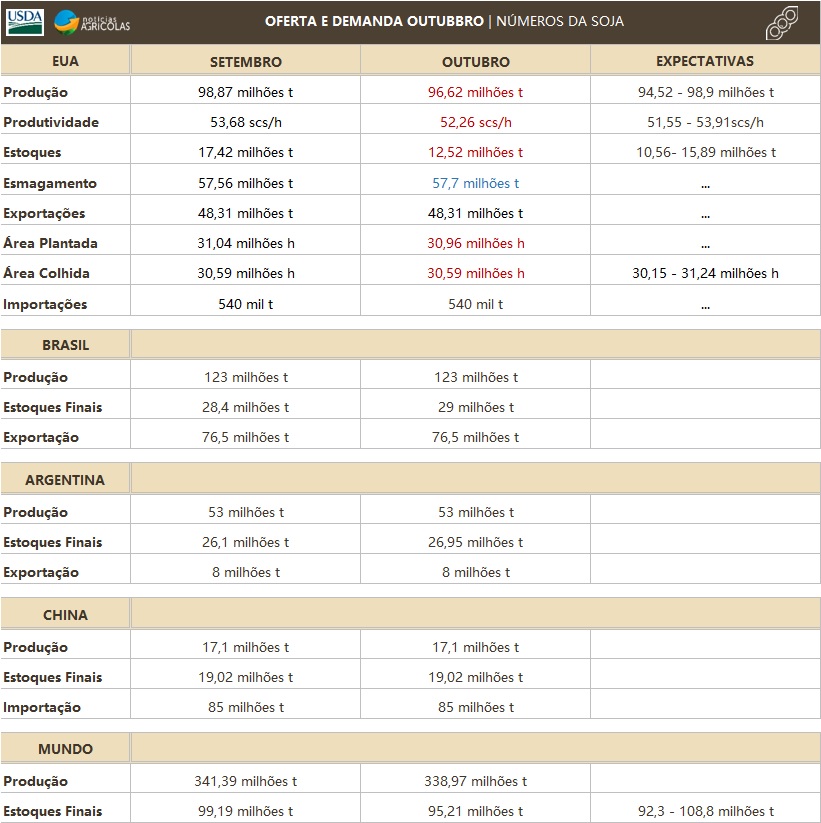 A produção do Brasil ainda foi estimada em 101 milhões de toneladas, enquanto a da Argentina ficou nos mesmos 50 milhões. Os estoques brasileiros, porém, subiram de 5,49 para 8,28 milhões de toneladas. As exportações do Brasil ainda são esperadas em 34 milhões de toneladas e as da Argentina em 33,5 milhões.