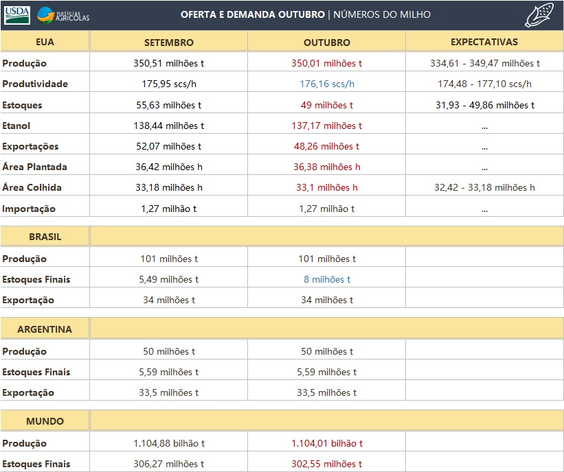 O USDA estimou a safra mundial de milho em 1.104,01 bilhão de toneladas neste reporte de outubro, menor do que o número de setembro de 1.104,88 bilhão. Os estoques finais passaram de 306,27 para 302,55 milhões de toneladas.