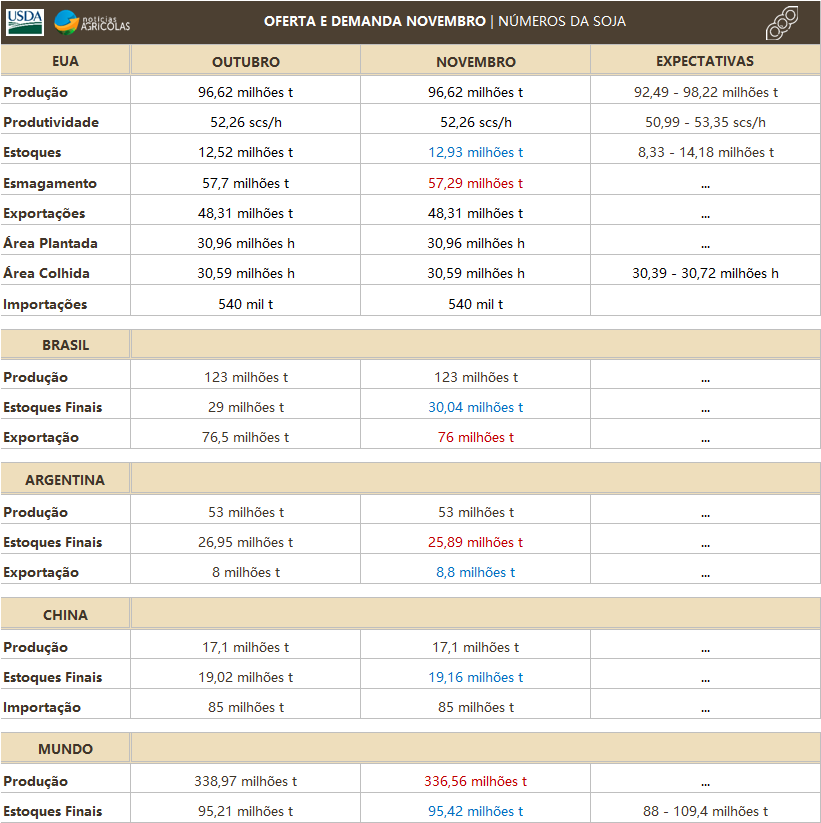 A produção foi mantida em 96,62 milhões de toneladas, a produtividade em 52,26 sacas por hectare, e a exceção foram os estoques finais. Ao contrário das expectativas, o USDA elevou os estoques para 12,93 milhões de toneladas, contra 12,52 milhões de outubro.