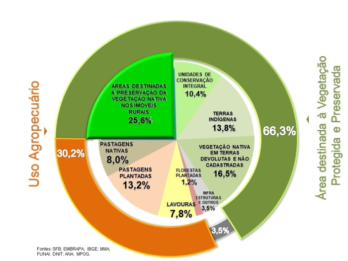 Mapeada detalhadamente pela Embrapa Territorial, a área total destinada à preservação, manutenção e proteção da vegetação nativa no Brasil ocupa 66,3% do território. Nesse número, estão os espaços preservados pelo segmento rural, as unidades de conservação integral, as terras indígenas, as terras devolutas e as ainda não cadastradas no SiCAR. Elas somam 631 milhões de hectares, área equivalente a 48 países da Europa somados.