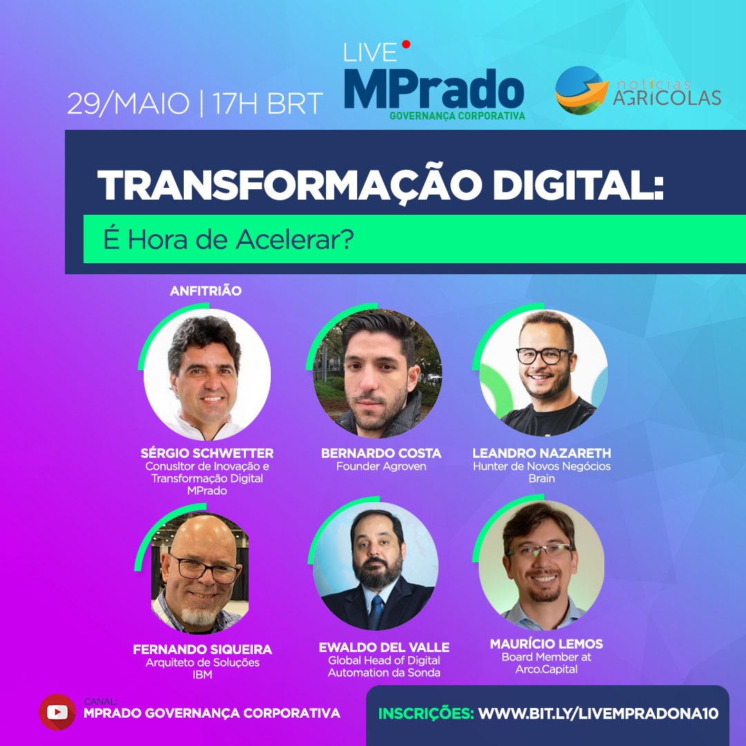 No debate desta sexta-feira (29/05), às 17 horas será discutido sobre "Transformação digital: É hora de acelerar?", com a presença de Sérgio Schwetter, consultor de inovação e transformação digital MPrado, Bernardo Costa, founder Agroven, Leandro Nazareth, hunter de novos negócios Brain, Fernando Siqueira, arquiteto de soluções IBM, Ewaldo Del Valle, global head of digital automation da Sonda e Maurício Lemos, board member at Arco.Capital.