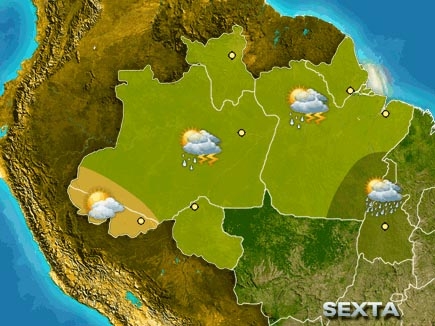 Áreas de instabilidade associadas ao ar quente e úmido provocam chuva a qualquer hora no TO e no norte do AM. Ar seco mantém o tempo firme no litoral do AP e no AC. Nas demais áreas as nuvens aumentam no decorrer do dia e chove à tarde.