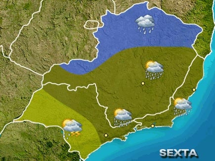 Tempo fechado e chuvoso no norte e oeste mineiros nesta sexta-feira. Em SP, sul e leste de MG e no norte do ES, o sol aparece pouco e chove a qualquer hora do dia. Demais áreas com sol, nebulosidade variável e chuva a partir da tarde. Tempo abafado.