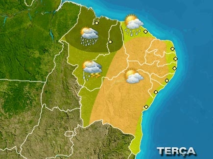 Sol e tempo firme entre o centro-sul do CE e o centro da BA. Sol entre muitas nuvens e chuva a qualquer hora no MA e no norte do PI. Pode chover forte. Sol e chuva passageira nas demais áreas da Região.
