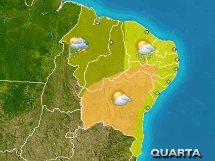 O tempo fica firme no centro-oeste da BA e de PE e no oeste de AL. Sol e chuva passageira na faixa entre o leste da BA e o CE. Sol, aumento de nuvens e pancadas de chuva à tarde, que podem ser fortes, no MA e no PI.