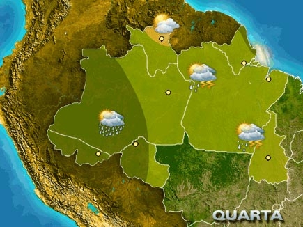O sol aparece e a sensação é de tempo abafado na Região. Ocorrem pancadas de chuva a qualquer hora no AC, em RO e no sul e oeste do AM. Nas demais áreas da Região ocorrem pancadas de chuva a partir da tarde. Tempo firme no norte de RR.