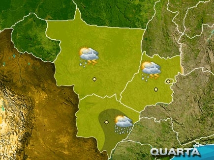 Uma massa de ar quente e úmido predomina sobre a Região Centro-Oeste. No sul de GO e no centro-leste de MS há previsão de pancadas de chuva a qualquer hora do dia. Nas demais áreas da Região ocorrem pancadas de chuva a partir da tarde.