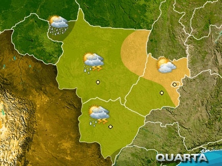 Uma massa de ar seco ganha força, o sol predomina e não chove no DF e no norte de GO. Áreas de instabilidade formam nuvens carregadas que provocam chuva a qualquer hora no sul de MS e norte de MT. Sol e chuva isolada à tarde nas demais áreas.