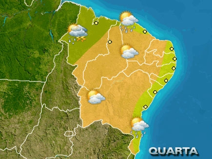 O ar fica seco, o sol predomina e não chove em grande parte do Nordeste. Na faixa leste da Região, entre a BA e o RN e no norte do CE o sol brilha forte e chove apenas de forma passageira. Sol e pancadas de chuva no centro-norte do MA e norte do PI.