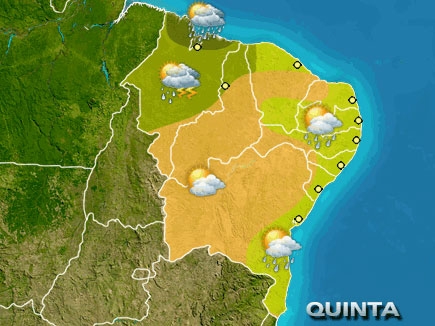 Uma massa de ar seco mantém o tempo firme no interior da BA, no oeste de PE, da PB e do RN e no sul do CE, do PI e do MA. No norte do MA e na faixa leste entre AL e PE chove a qualquer hora. Sol forte e chuva rápida nas demais áreas.