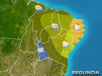 Risco de chuva forte no sul e centro-oeste da BA, no MA e no PI. Sol com muitas nuvens e chuva no norte do CE. O sol predomina e não chove em SE, em AL, no leste de PE, na PB e no RN. Sol e chuva passageira nas demais áreas.